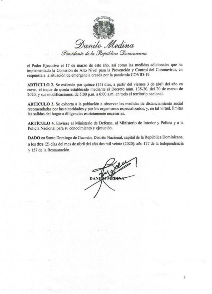 El Poder Ejecutivo emitió un decreto en el que se mantiene vigente por un plazo adicional de 15 días, a partir del viernes 3 de abril del año en curso, todas las medidas de distanciamiento adoptadas el pasado 17 de marzo por el coronavirus.