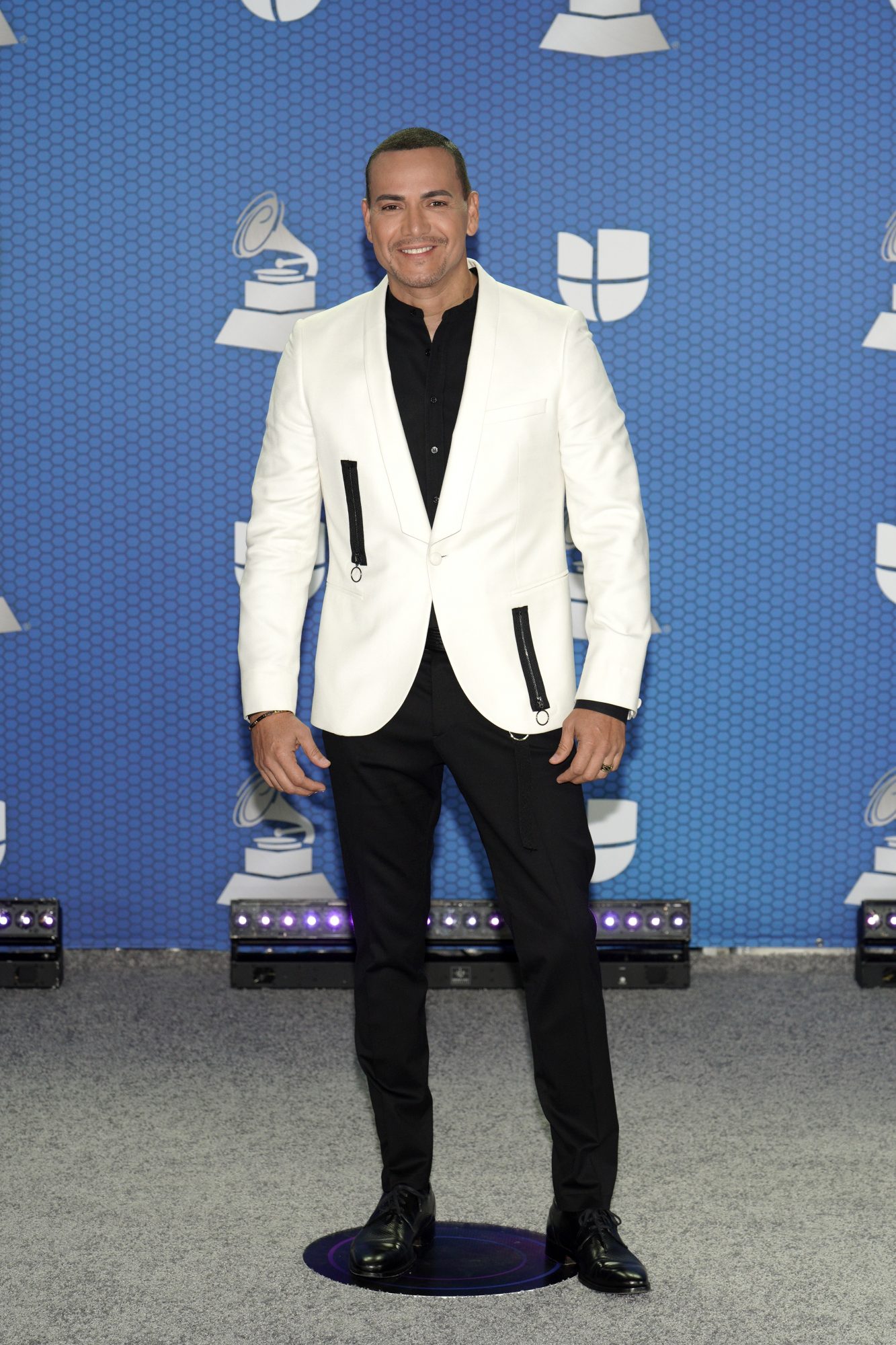 El salsero llegó a la alfombra luciendo moderno y elegante con pantalón y camisa negra, y una chaqueta blanca que complementó muy bien su look.