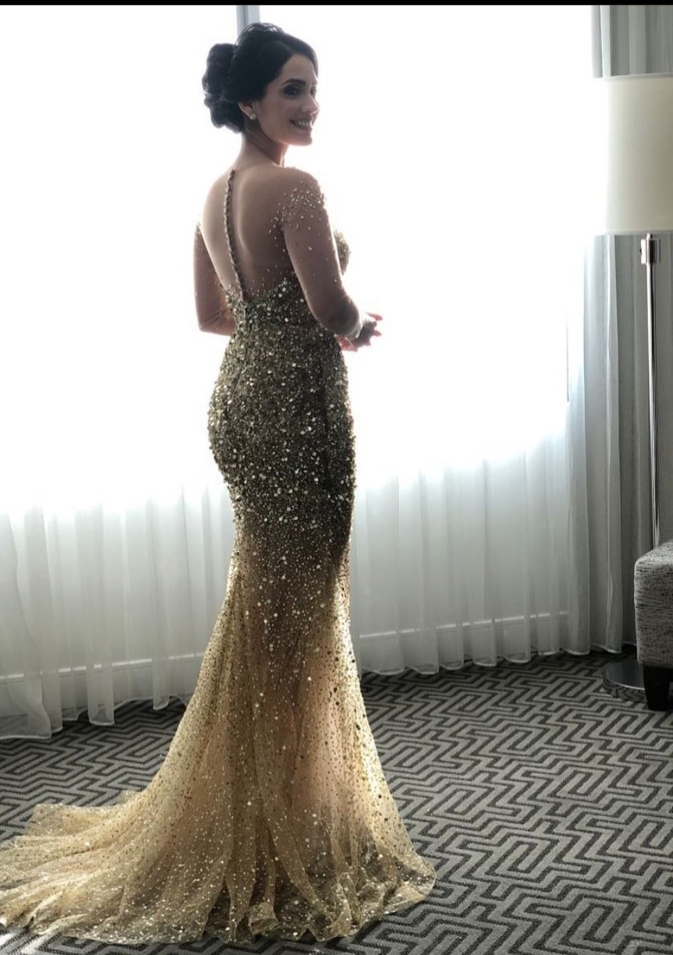 Hermosa y elegante, con un vestido de brillo y piedras doradas ceñido al cuerpo (de Bride to Be). Maquillaje delicado, muy nude (ella no necesita mucho para destacar ese rostro) y un recogido impecable dieron la nota final a este gran estilismo.