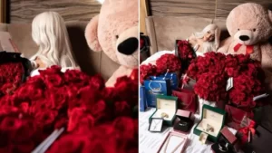 A través de su cuenta de Instagram la “La más viral”, mostró joyas, varios arreglos de rosas rojas, un oso de peluche gigante y una nota con una dedicatoria.